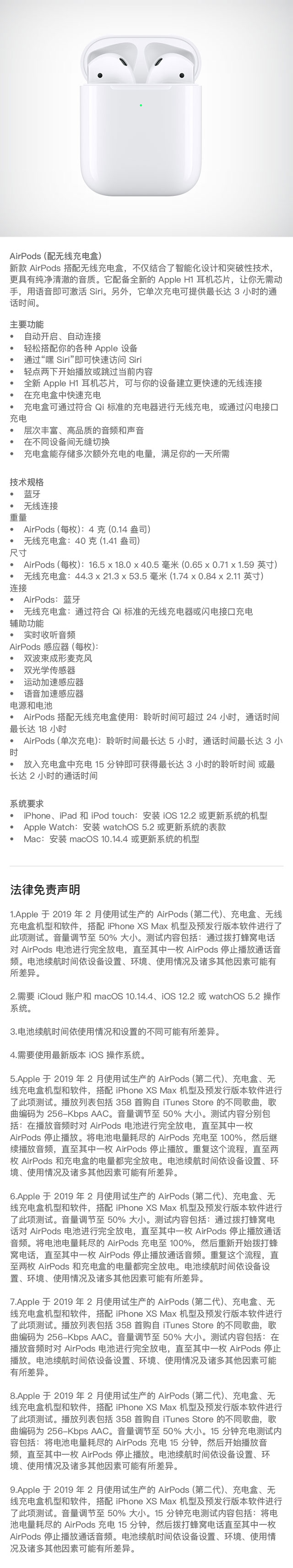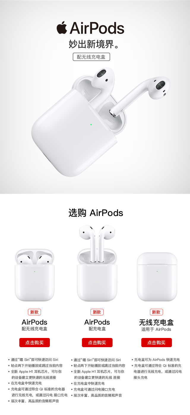 苹果蓝牙耳机Apple AirPods2代 有线充电/无线充电 H1芯片 半入耳式